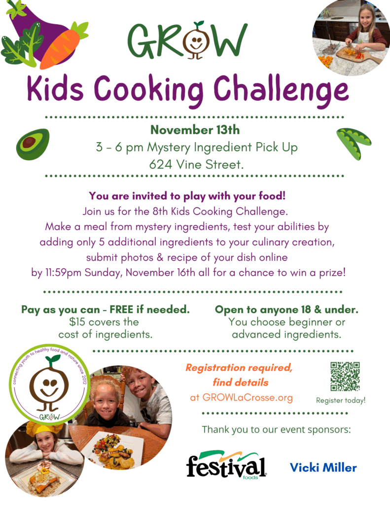 Put your skills to the test in the Kids Cooking Challenge, which will kick off with the Mystery Ingredient pick-up on November 13th. GROW provides the opportunity for kids to get creative in the kitchen for a chance to claim the title of Kids Cooking Challenge Champ. Pick up your mystery produce, create an original recipe with the items inside, take pictures of your final dish, and submit your recipe and photos online.